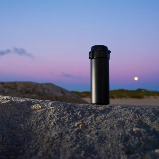 Utrzymuje temperaturę powyżej 40°C przez 16 godzin. Szczelne zamknięcie typu leak proof. Dwie ścianki ze stali nierdzewnej, zarówno wewnątrz jak i na zewnątrz zastosowano stal nierdzewną 18/8 o podwyższonej jakości. Podstawa kubka z silikonu.